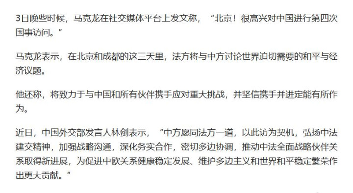 并且还对接下来的日程表达了期待,称“在北京和成都的这3天,中法将讨论和平与经济议题,并且相信跟中国携手并进,定能有所作为。”